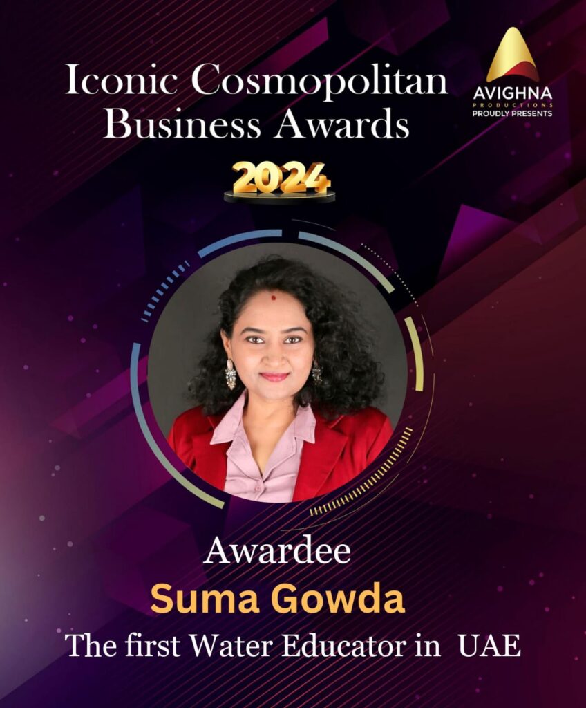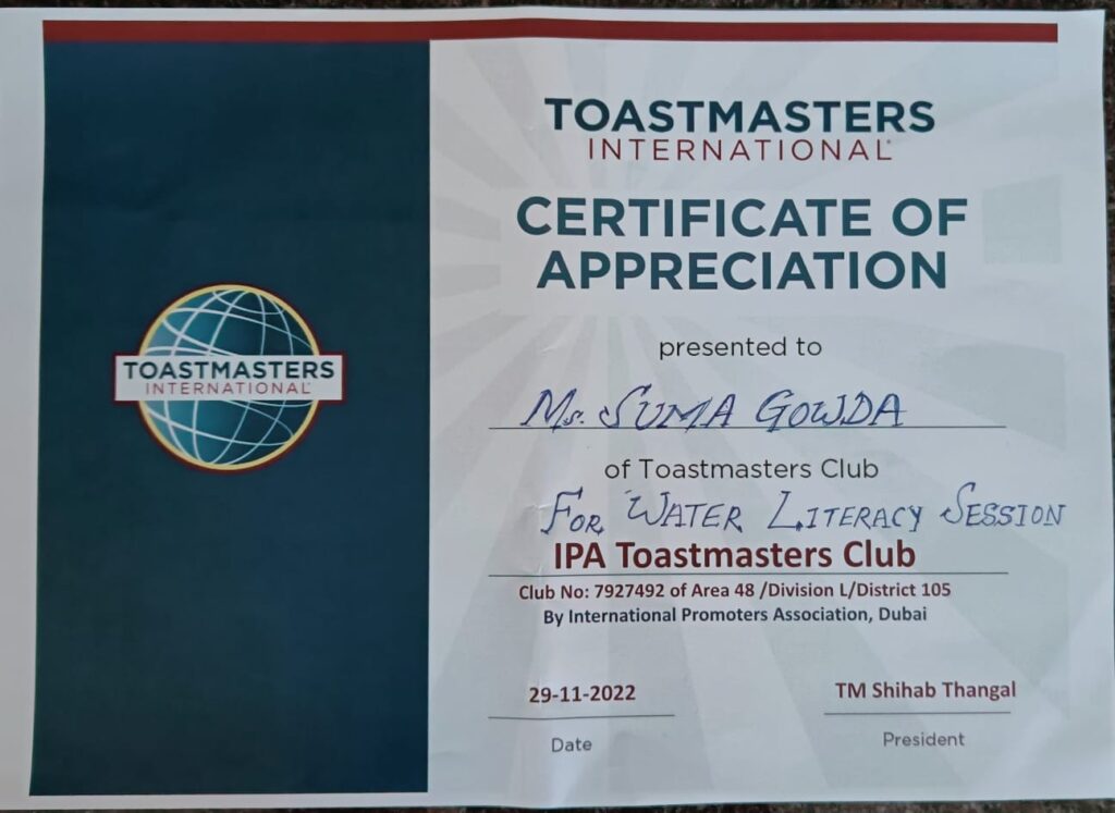 My work has been recognised being honoured as "first water educator in the UAE" at the iconic business awards by Avighna Productions, a speaker at Jala Shikshak global water literacy events in California (Online) and delivering sessions on importance of water literacy at toastmasters International in Dubai.